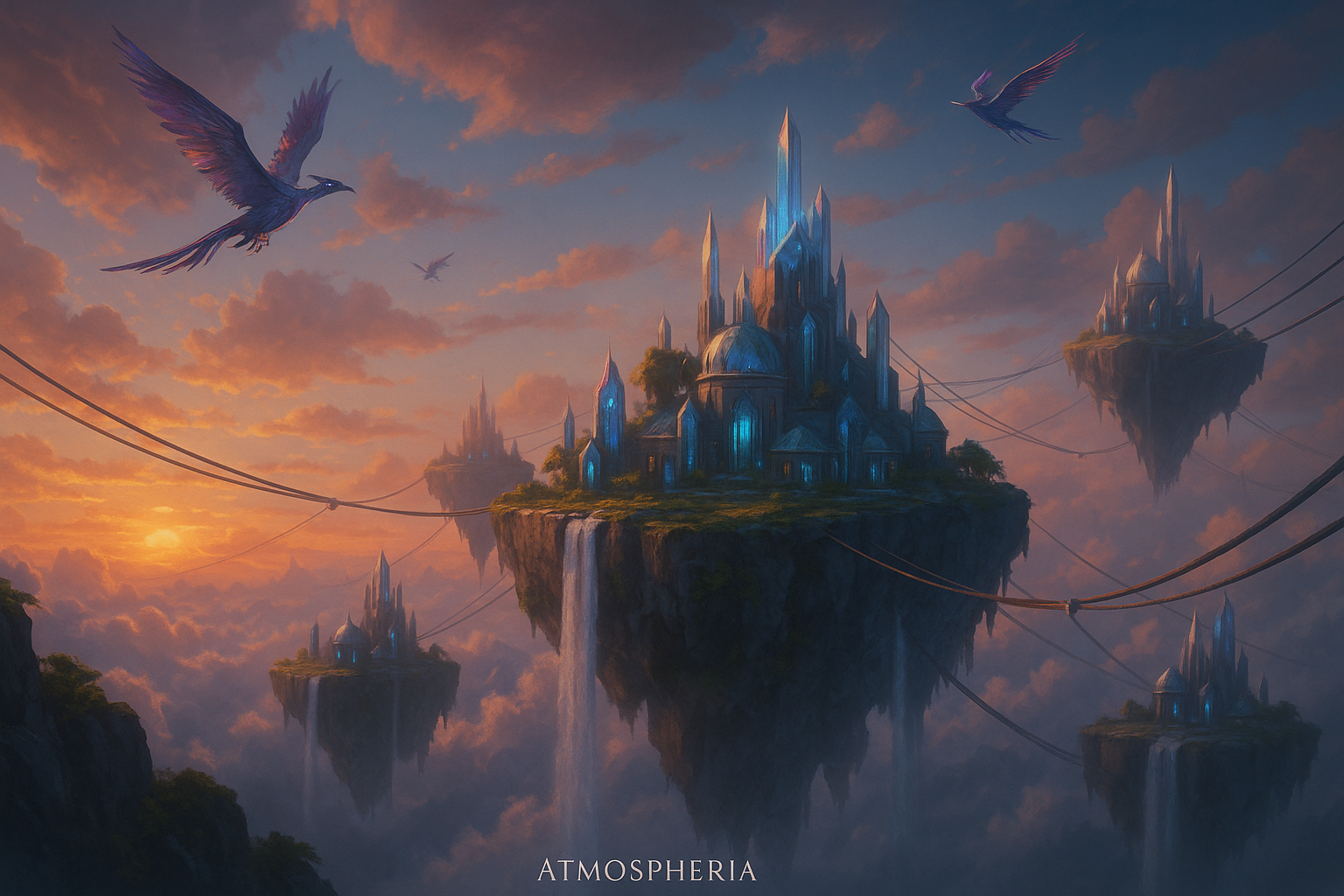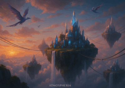 Suspended high above the world, Atmospheria floats on islands tethered by ziplines and bridges of light. Its people soar like the wind, and its skies blaze with storms—an untamed realm of breathtaking freedom and peril.