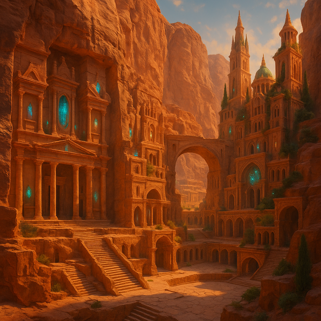 A city carved from living stone, resembling Petra itself, Desteria glows with ancient power and artistry. Its hidden chambers and fiery heart make it both sanctuary and battlefield—where secrets buried in the walls can change the fate of nations.